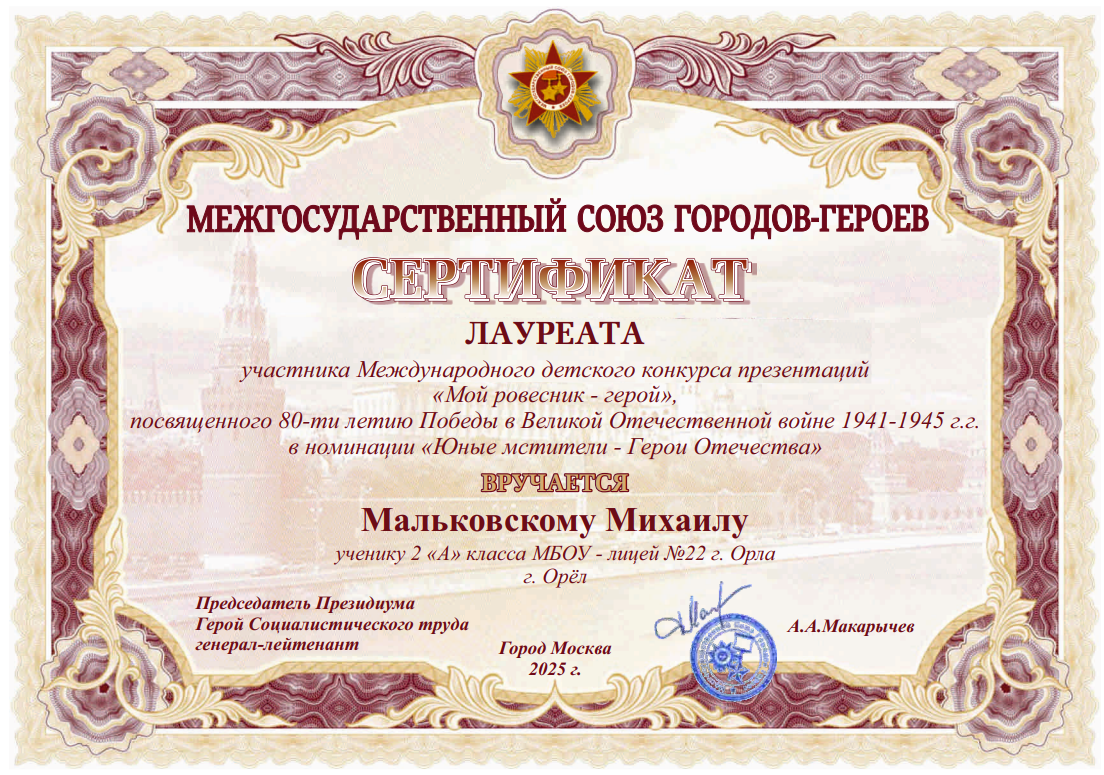 Лауреат: обучающийся 3А класса Мальковский Михаил.