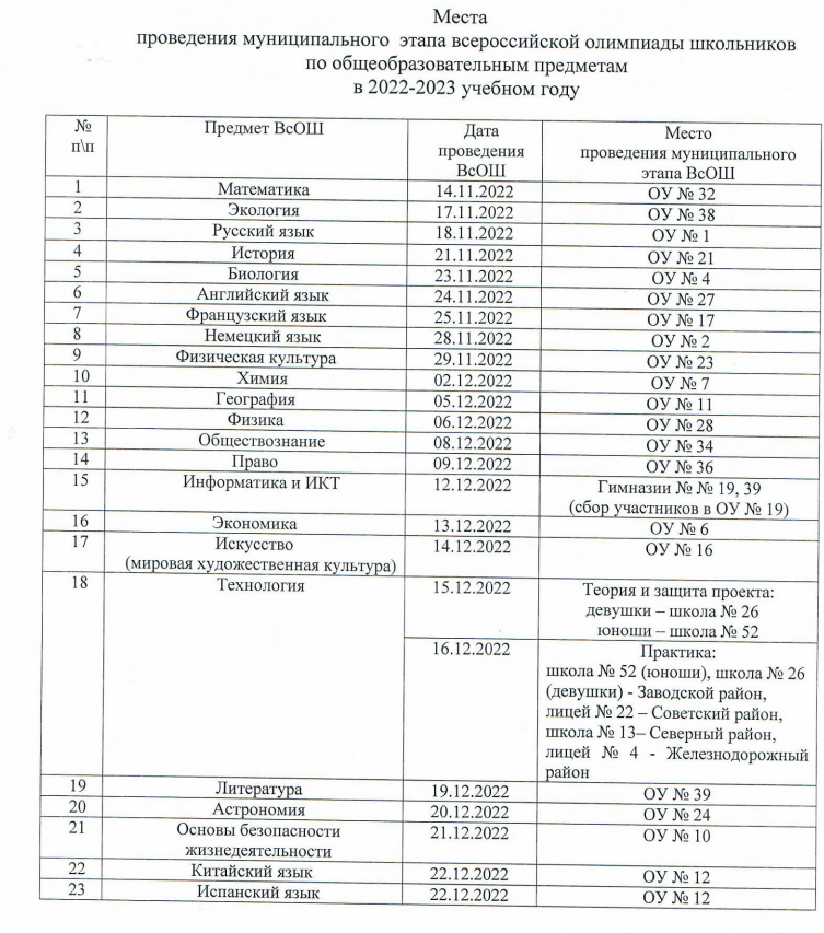 Места проведения муниципального этапа ВсОШ по общеобразовательным предметам в 2022-2023 уч. году